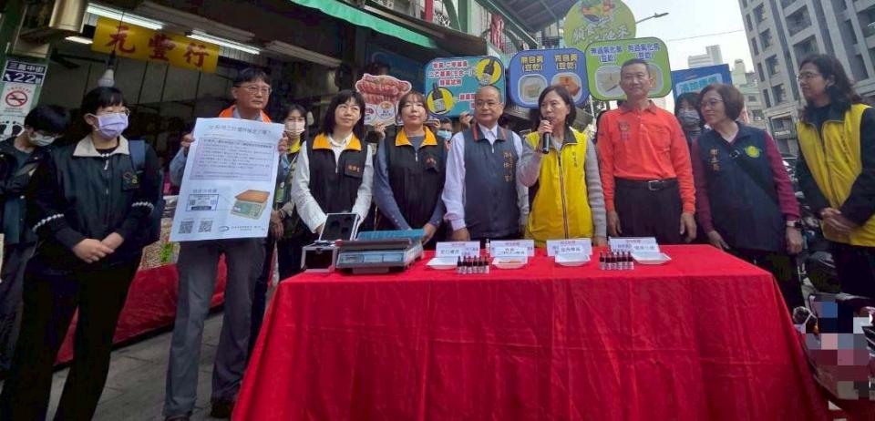 農曆春節將至,高市衛生局簡任技正何惠彬1月28日在市府行國處主任消保官殷茂乾、行政院消保官、高市農業局、衛生福利部食品藥物管理署南區管理中心、經濟部標準檢驗局高雄分局等單位代表陪同下稽查三鳳中街年貨大街應景食品、肉品原產地標示、環境衛生等,並使用衛生局自製皂黃及過氧化氫試劑演示豆製品快篩,結合市府消保官說明公秤使用方式,把關飲食安全。