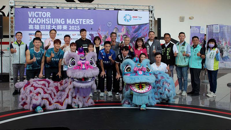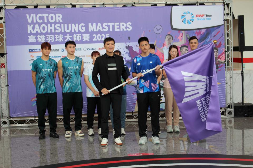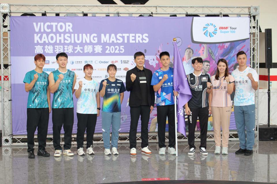 VICTOR 2025高雄羽球大師賽9月23日至28日在高雄巨蛋體育館開打,印尼、馬來西亞、印度、日本、泰國、新加坡等15國287名好手同場競技,角逐總獎金11萬美元,中華羽球協會理事長張國祚授旗世界大學運動會羽球男單金牌丁彥宸,並領軍女單許玟琪、男雙黃睿璿、男雙賴柏佑與蔡富丞、女雙楊筑云、混雙吳冠勳與李佳馨等選手高舉雙拳,宣示全力留住冠軍獎盃,運動部國際事務司副司長許秀玲、高市運動發展局副局長謝汀嵩、財政部高雄國稅局長翁培祐、中華電信高雄營運處副總孫明源等人見證,羽球天后戴資穎9月28日總決賽現身與球迷同樂,當天購票者可免費續看鬥拍全國總決賽,9月26日至28日憑入場券可兌換機能飲品一瓶,拓元售票系統有預售票,指定網路平台全程直播。圖與文/高培德