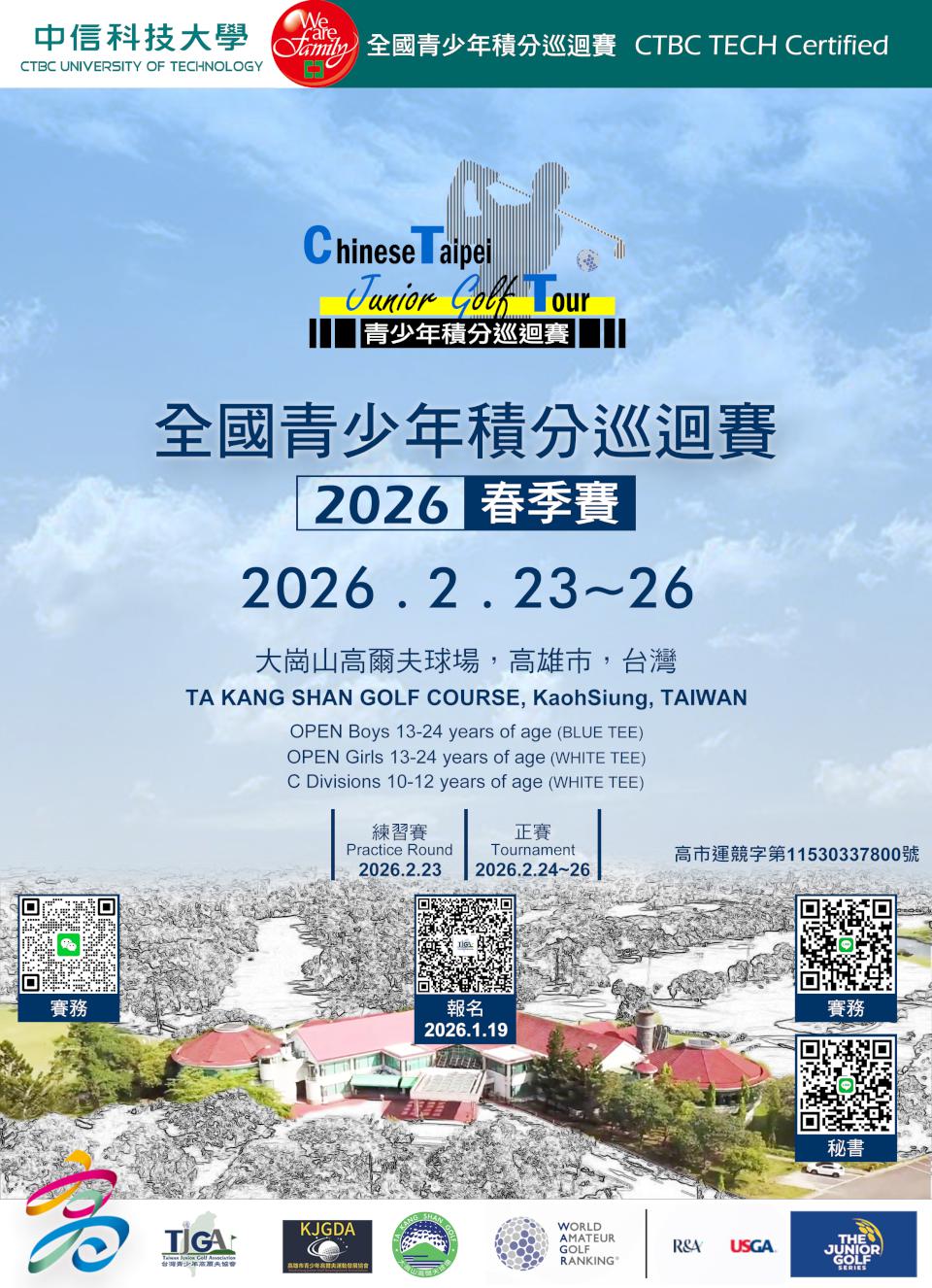 台灣青少年高爾夫協會、高市青少年高爾夫運動發展協會合辦2026年全國青少年積分巡迴賽春季賽2月23日至26日在高市阿蓮區大崗山高爾夫球場舉行,規劃首日練習賽、第二至四天正賽,1月19日報名截止,另規劃高市信誼高爾夫球場5月12日至14日夏季賽、7月21日至23日信誼盃青少年、9月1日至3日秋季賽、高市大崗山高爾夫球場11月7日至19日冬季賽、台南高爾夫俱樂部12月21日至24日菁英比洞賽等賽事,成績列入世界業餘高爾夫排名(WAGR)、中國高爾夫球協會青少年積分排名(GJGR)、美國青少年高爾夫積分榜(JGS)等系統。