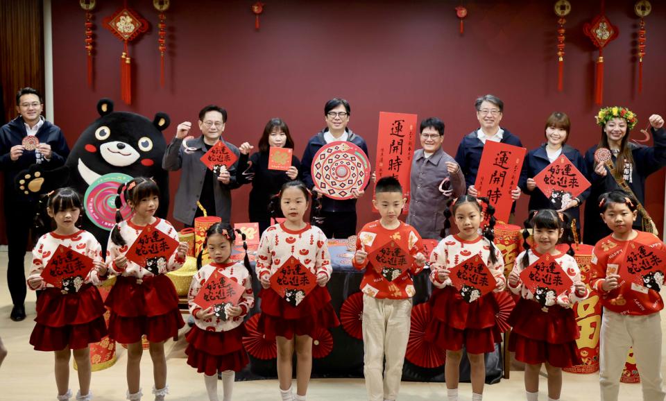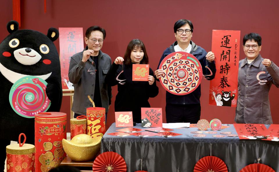 高雄市長陳其邁1月10日攜手觀光局吉祥物高雄熊向市民拜早年,並與書法名家陳民芳、平面設計師劉憶萱開箱揭示《運開時泰》春聯、《好運蛇進來》斗方春聯、《蛇來運轉》開運小紅包、《好蛇年》賀卡等限定版新春小物,他說,各項市政建設城市競爭力指標排名六都首位,可謂豐收一年,祈願新年國泰民安、風調雨順,也預祝市民心想事成、平安吉祥。