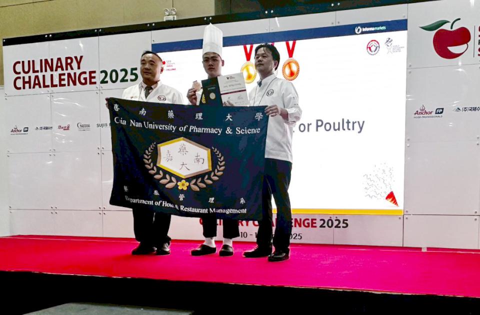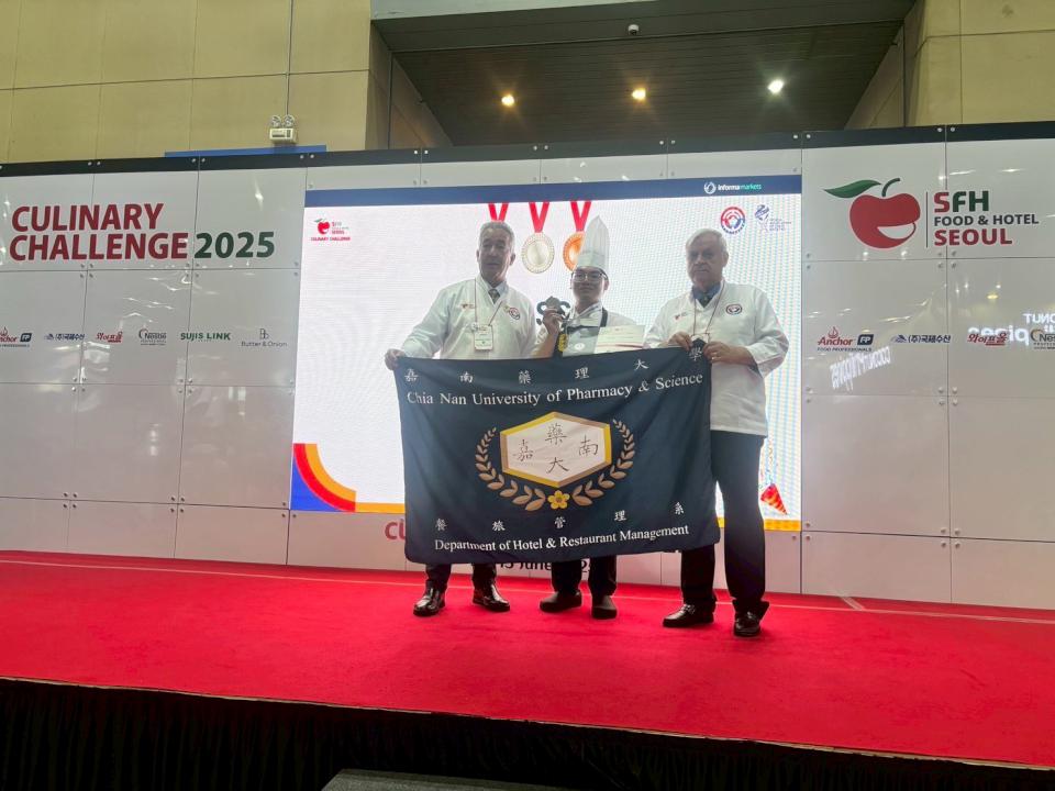 嘉南藥理大學餐旅管理系西餐廚藝隊再傳捷報!由指導老師曾楷勛帶領下,李旻豪、張冠傑、郭俊佑、孫明琮與明韋辰於6月中旬前往韓國,參加「2025首爾國際廚藝挑戰賽(Seoul International Culinary Challenge)」勇奪三銀、四銅與八項佳作,為校爭光。