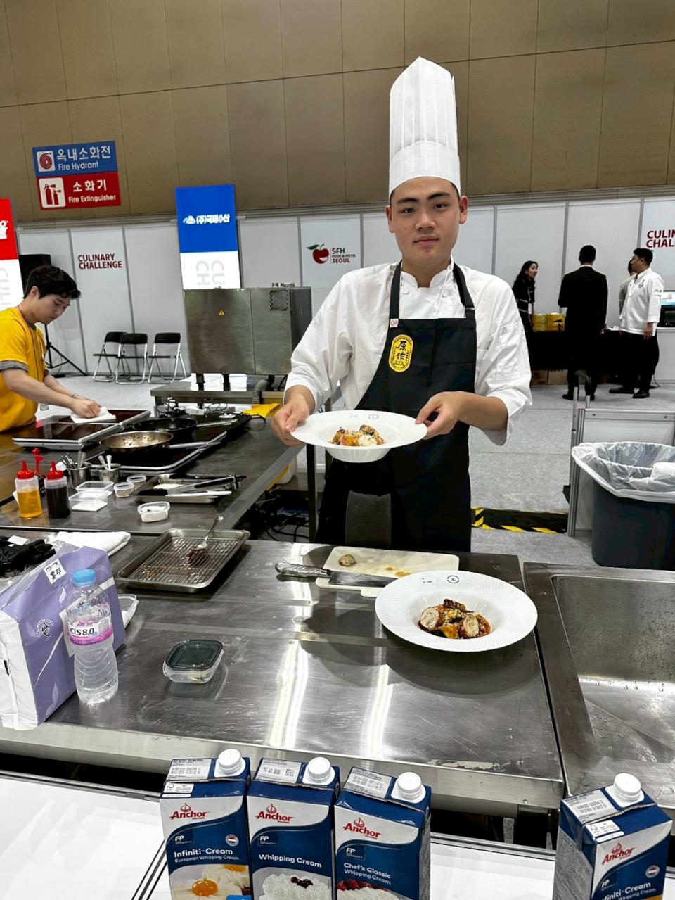 連續兩年征戰國際賽的孫明琮,在去年於檳城賽獲得銅牌後,今年再接再厲參賽,這次特地提升整道菜的層次與精緻度,憑藉「三色義大利餃皮包裹雞慕斯內餡搭配雞腿捲佐紅醬」奪得銀牌,成功吸引評審目光。