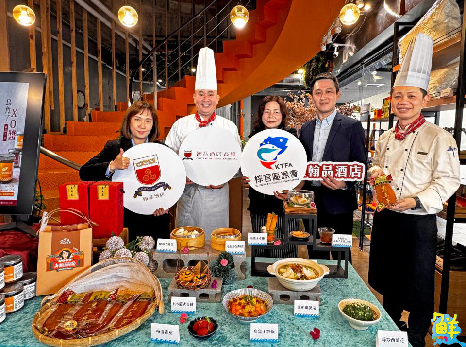 ▲高雄翰品酒店攜手梓官區漁會,推出烏魚子港點,高雄市梓官區漁會理事長孫黃秀英(中)以及總幹事張鈞華(左二)蒞臨指導
