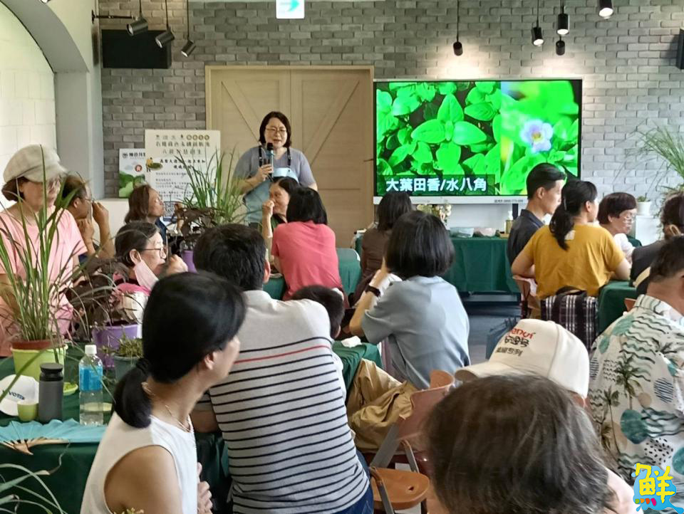 ▲美濃客家文物館「七感療癒食農體驗工作坊」,高餐大飲食文化暨餐飲創新研究所所長曾裕琇為民眾介紹客庄水生植物