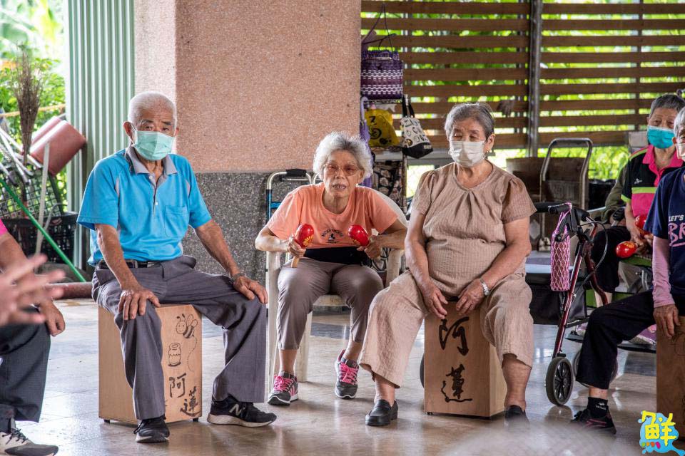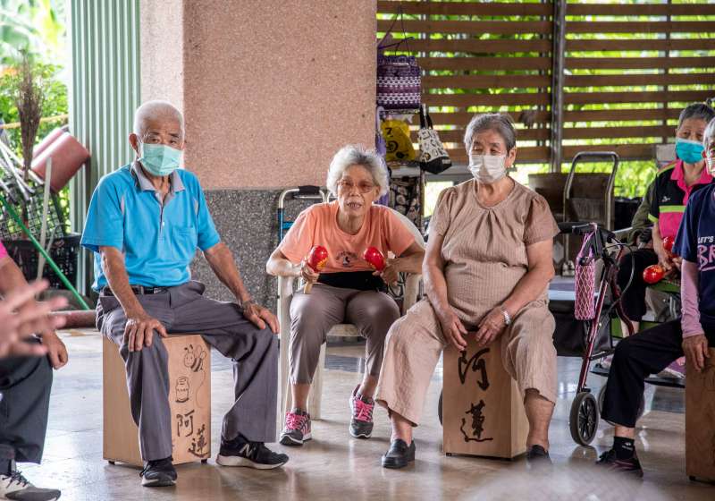 ▲長輩們用親手製作的木箱鼓賣力練習