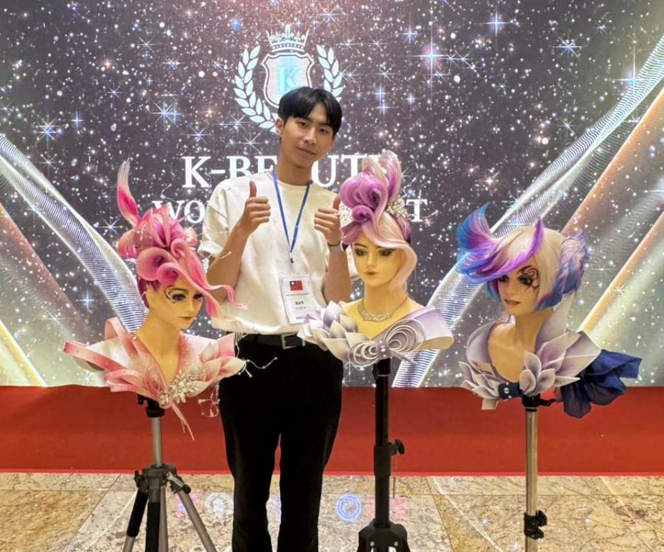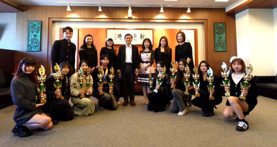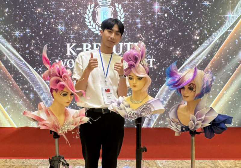 高市樹德科技大學美髮設計與經營系教師唐宥紾、林妙禪、傅美慧、邱琇渝指導二年甲班學生葉俊彥(圖一)參與「2025 K-BEAUTY WORLD CONTEST 國際韓國美容美髮競賽」,囊括創意盤髮宴會、創意盤髮新娘盤髮、創意染髮設計三面金牌,另林妤真獨得時尚創意剪髮、創意盤髮設計新娘盤髮金牌、創意染髮設計銀牌,楊璿茵捲髮技術銀牌標準冷燙(靜)銀牌,許主憶基礎剪髮金牌、時尚創意剪髮銀牌,張芸瑄新娘彩妝設計、機器紋繡銀牌,吳家綺沙龍藝術美甲金牌、睫毛延長技法銅牌,林子琦夢幻藝術美甲金牌、光療美甲銀牌,林黛真M&M 2D/3D美甲金牌、芳香療法銀牌,校長王昭雄(圖二後排中)等人與有榮焉。