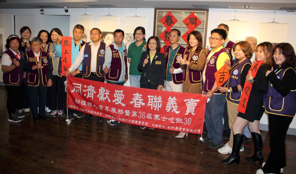 高都同濟會會長王志傑(圖一中)1月29日代表捐贈10萬元善款,支持植物人病友常年服務及第36屆寒士吃飽30活動,創世基金會高雄分會院長周冠華回贈感謝狀,同濟會也力邀高市中國書畫學會理事長蔡嘉琛(圖一左)、常務理事陳俊合(圖一右)現場揮毫斗方及春聯義賣,所得全數轉贈創世高雄分會,王志傑說,連續6年資助寒士吃飽30活動,捐贈善款同時義賣春聯,號召社友響應送禮到家服務。周冠華說,感謝高都同濟會長期支持,嘉惠植物人病友家庭。
