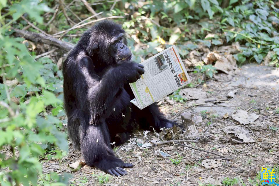 ▲黑猩猩「莉忠」拿起報紙造型書本,獨自探索其中奧妙