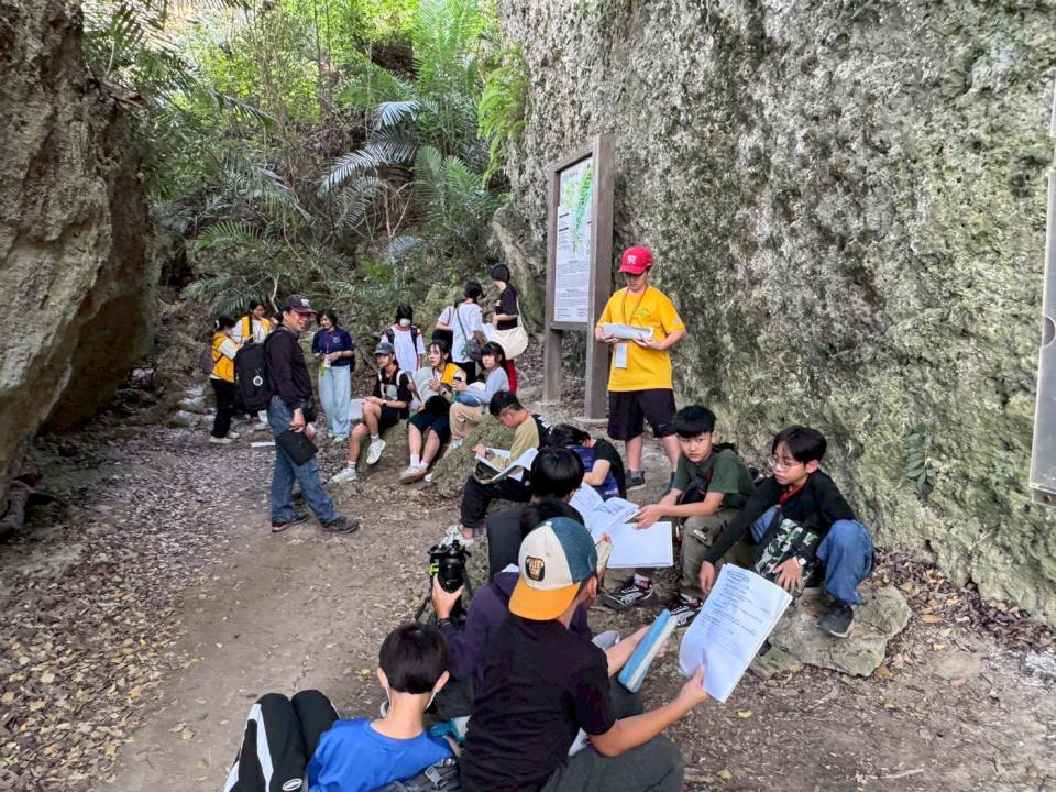 吳峯森說明山棕與賽夏族矮靈祭淵源,深入淺出引導學員認識在地生態連結文化,攻頂途中也巧遇白腰鵲鴝、翠翼鳩、大冠鷲、東方蜂鷹等鳥類,學生驚呼連連。