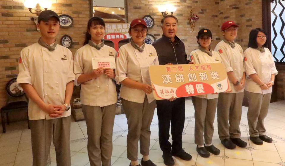 國立高雄餐旅大學攜手舊振南餅店續辦第二屆產業學苑,中餐、西餐廚藝、烘焙及五專部等30名學生錄取,西廚系學生選用艾草麻糬包入菜脯、紅蔥頭、筍子等內餡開發草仔粿布雪,另義式油封番茄加入羅勒、香蒜大火快炒製成義式香料油封蕃茄布列塔妮,西廚系蔡柏毅(圖一左一)、簡均穎(圖一左二)、柳宇芯(圖一左三)、謝喬宇(圖一右三)、謝宜蓁(圖一右二)、鄒安俐(圖一右一)等學生拿下第一名,接受舊振南董事長李雄慶(圖中)頒獎表揚,高餐大代理校長陳國泰說,肯定業者長期善盡社會責任,產業學苑有助學生及早接軌職場。