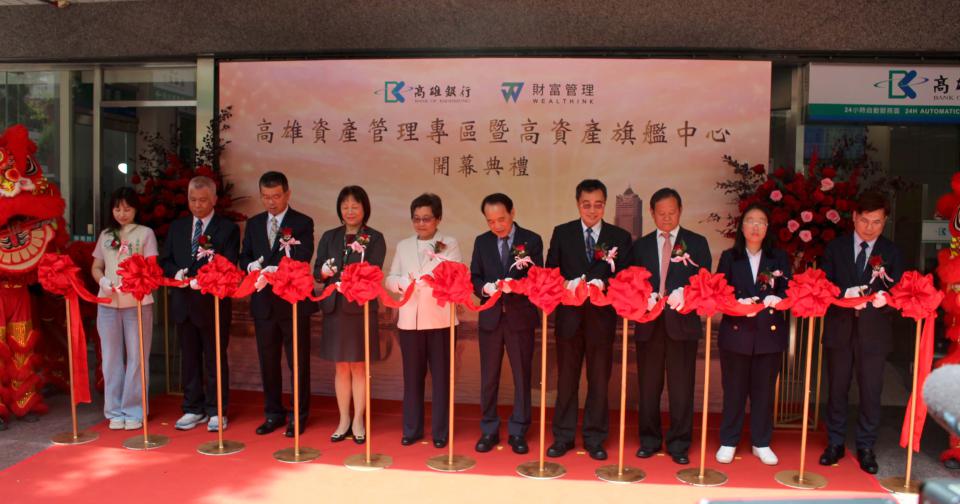 高市副市長林欽榮、高雄銀行董事長徐翠梅、高市財政局長李瓊慧、經發局副局長林廖嘉宏等人4月28日剪下紅綵,宣布高雄銀行資產專區分行與高資產旗艦中心同步進駐苓雅區中華四路開幕迎賓,透過保單及保費融資與自益特定金錢信託受益權質借等金融工具並結合專業稅務規劃,強化客戶資金調度與資產流動性,副市長林欽榮說,高市從傳統製造業轉型升級,伴隨半導體S廊帶、淨零轉型、亞灣2.0計畫啟動,匯聚資金與人才,帶動金融及保險業成長,排名六都首位,金管會核定高雄專區56家金融機構試辦業務,另有68家攜手市府簽約,期待業者運用在地經營優勢,串連國立中山大學、高雄金融科技創新園區等能量,型塑完善,金融生態系。圖與文/高培德