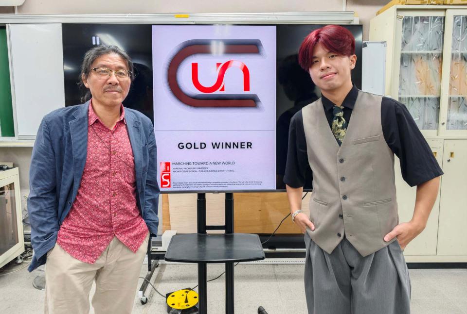 國立高雄大學建築系大四生彭義棠(圖右)勇奪美國華盛頓特區國際競賽協會發起聯合國設計獎(UN Design Award)跨國設計競賽建築設計類金獎,成為唯二獲獎者,建築系主任陳逸杰(圖左)說,彭義棠在校期間自主學習,善用數位工具輔助設計。
