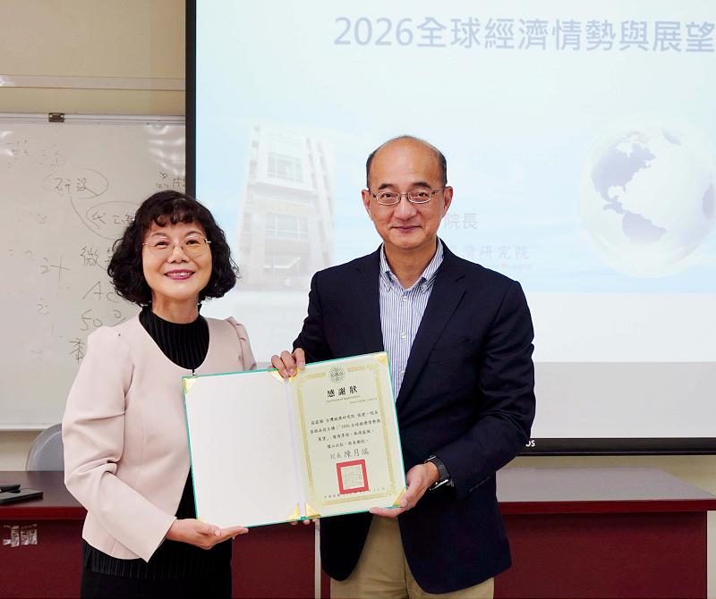 高市空中大學工商管理系4月11日全球經濟專題講座邀請台灣經濟研究院院長張建一(圖一右)主談「2026全球經濟情勢與展望」,深入解析全球總體經濟走勢、地緣政治風險、台灣經濟發展、匯率變動趨勢,學習指導中心與法律系合辦律師上榜經驗分享座談同步登場,3名律師高考及格法律學分班學員分享學習經驗與備考歷程,高空大校長陳月端(圖一左)說,張建一長期關注世界經濟情勢變化及參與國家經貿政策擬定,透過講座,有助理解中央應對國際經濟變化,適時修正產業政策。