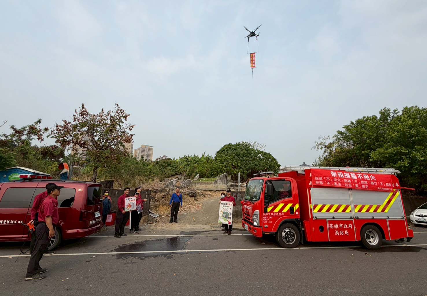 高市鳥松消防分隊3月21、22、29、30日、4月3至6日上午8點至10點、10點至12點、下午2點至4點人車定點巡查及無人機空中偵測公墓防火安全,3月28、29日、4月4、5日下午4點至6點加派無人機一組,如發現違反情事開單告發,結合義消第四大隊無人機及全證照管理員,透過無人機高空廣播、布條、海報、看板、警義消發放水袋等加強宣導。