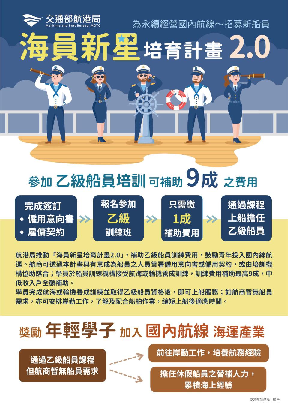 交通部航港局續推海員新星培育計畫2.0,加碼補助滿16歲且通過體檢青年,報名參與水手、機匠、大廚、服務員等乙級船員養成訓練最高9成(中低收入戶全額補助),培育航運產業新血。乙級船員養成訓練班為期2至3個月,課程內容涵蓋基本安全訓練、船舶保全職責、救生艇筏及救難艇操作、助理級航行、輪機當值等,114年結訓合格93人,其中75人媒合航商進用,就業媒合率達8成,更多計畫資訊可上航港局官網查詢或電洽財團法人中華航業人員訓練中心(02)24922118分機23 江組長、臺北海洋科技大學海事人員訓練部(02)28109999分機2621吳小姐。圖/航港局提供、文/高培德