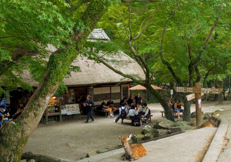 走進奈良公園,在春日大社北側、若草山的山麓,有一處被樹木環繞、頂著茅葺屋頂的「水谷茶屋」。