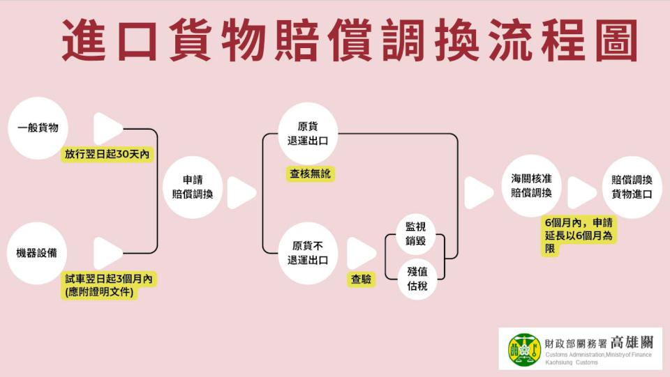 財政部關務署高雄關提醒,根據關稅法第51條及施行細則第40至42條等規定,進口貨物損壞規格、品質不符原合約,報關人應在通關後隔天30日內(機器設備試車隔天3個月內),檢附申請書、合約、發票、賠償協議、公證報告等相關文件向海關申請免稅。