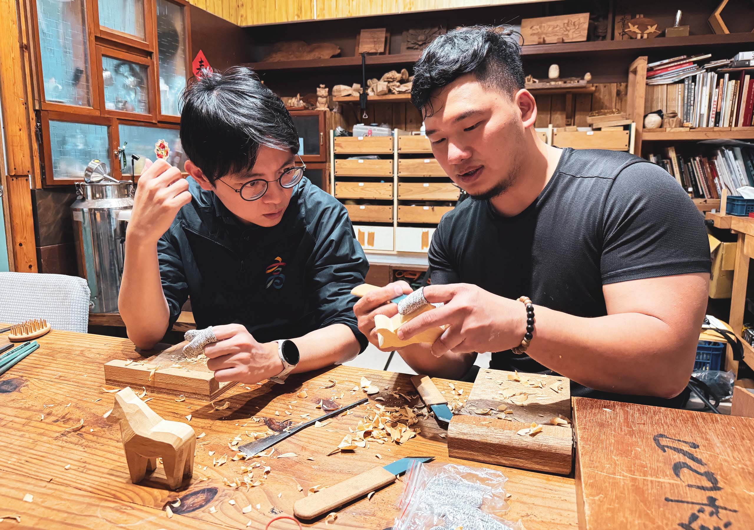 高市青年局長林楷軒(圖一左)訪視曾獲青創補助、站穩市場「共生學堂」,見證創辦人張晏睿(圖一右)透過木刻雕工,展現兼具專業與美學職人魅力,林楷軒說,張晏睿通過文化部傳統匠師認證,巧妙結合傳統木刻技法應用生活物件,春節期間規劃新營運與教學模式。