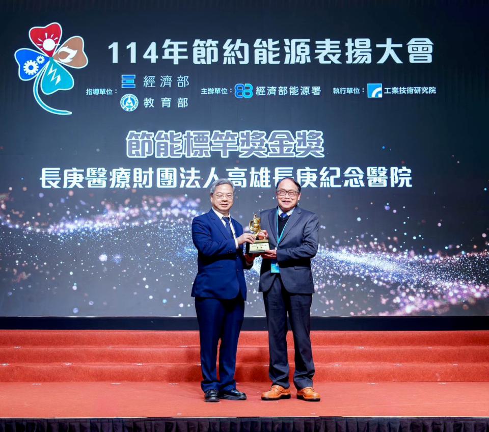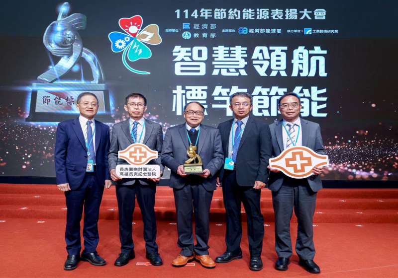 高雄長庚醫院節能創新成果榮膺114年經濟部節能標竿金獎,締造5度參賽賽4金1銀佳績,長庚醫療體系行政中心總執行長潘延健(圖一右)代表接受經濟部長龔明鑫(圖一左)表揚,長庚醫療體系行政中心執行長羅吉均、處長歐國松等人歡喜見證,潘延健說,長庚醫療體系秉持已故創辦人王永慶「資源有限,浪費就是最大的成本」與董事長王瑞慧「加大風量、節省空調用電」理念,致力落實節能減碳,工務團隊自主研發並費時半年測試,汰換小型送風機交流馬達變身直流,提升送風效率與風量,改善冷氣房舒適度,節電約47%。