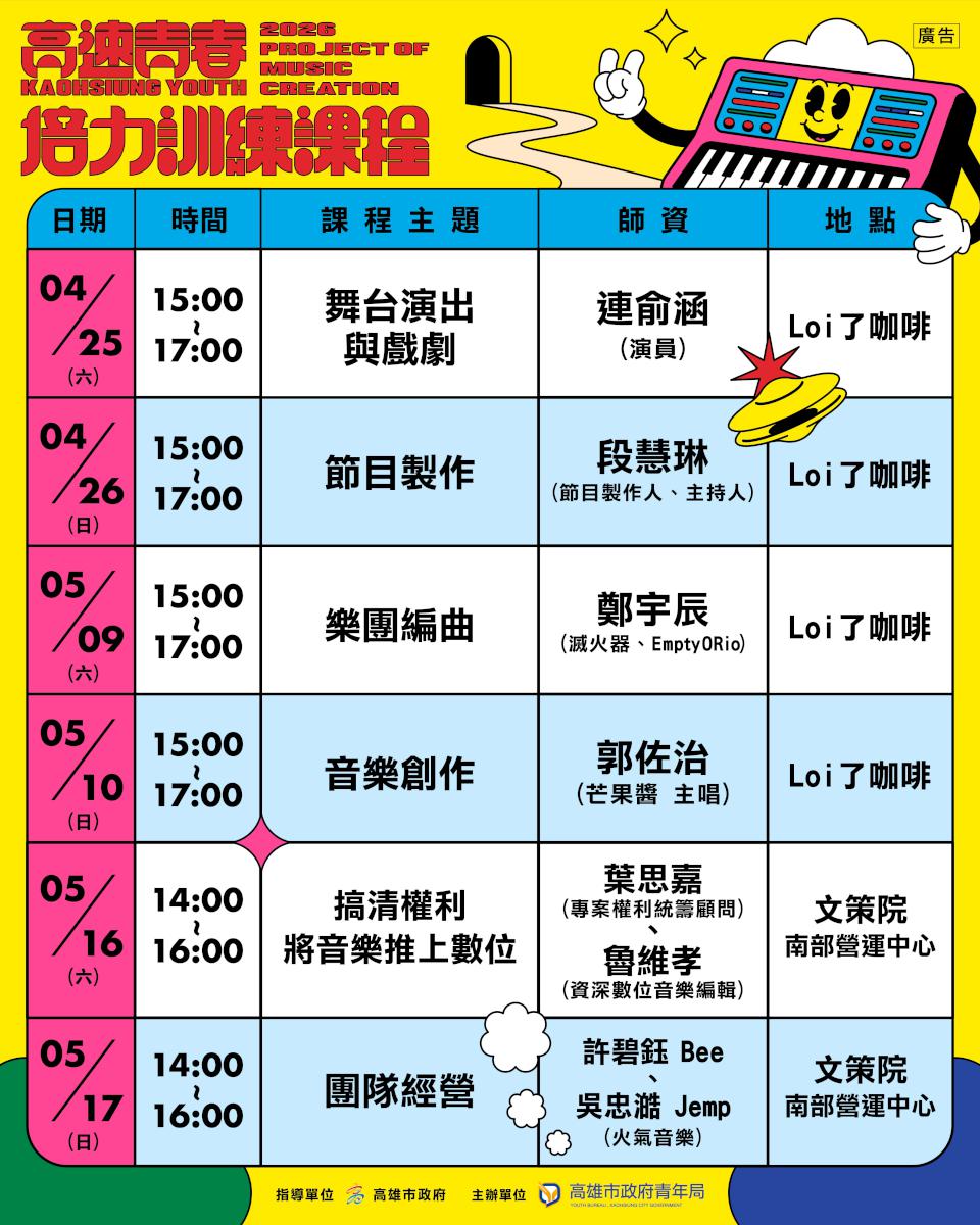 高市青年局2026年第6屆高速青春首波培力訓練課程,4月25日、26、5月2、3、9、10日規劃6堂,力邀金曲獎滅火器樂團吉他手鄭宇辰、金鐘獎連俞涵、入圍金曲獎最佳樂團芒果醬主唱郭佐治、外景主持人段慧琳、火氣音樂藝人總監許碧鈺、專案經理吳忠澔等人,指導青年從流行音樂、影視製作、表演藝術,即日起受理上網報名。