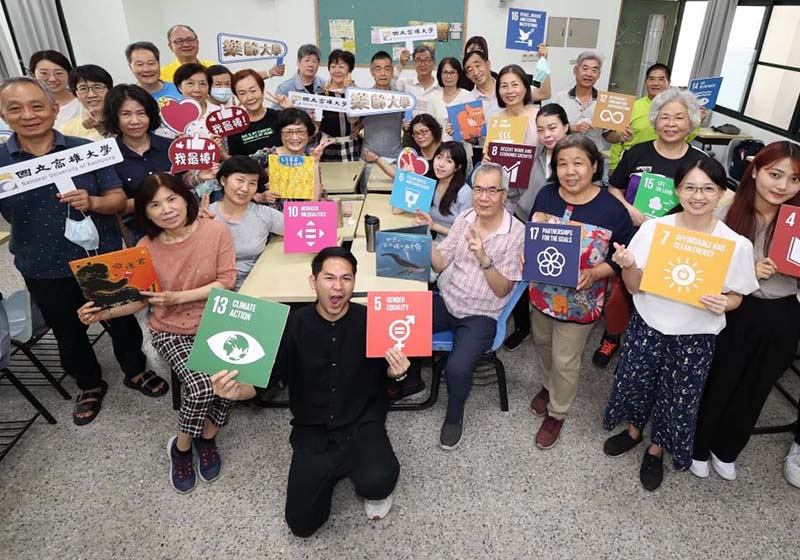 國立高雄大學通識教育中心副教授蔡奎如(圖一持SDG 7手牌者)4月18日安排聯合國永續發展目標(SDGs)學生大使、推廣教育中心樂齡大學學員參與青銀見面繪,搖滾爺奶創辦人林宗憲(圖一前排著黑衣者)引導青銀世代挑戰混齡編組競賽,參賽隊伍限時10分鐘,使用20張白紙及1捲紙膠帶建造幸福之塔,最高且不傾倒者獲勝。