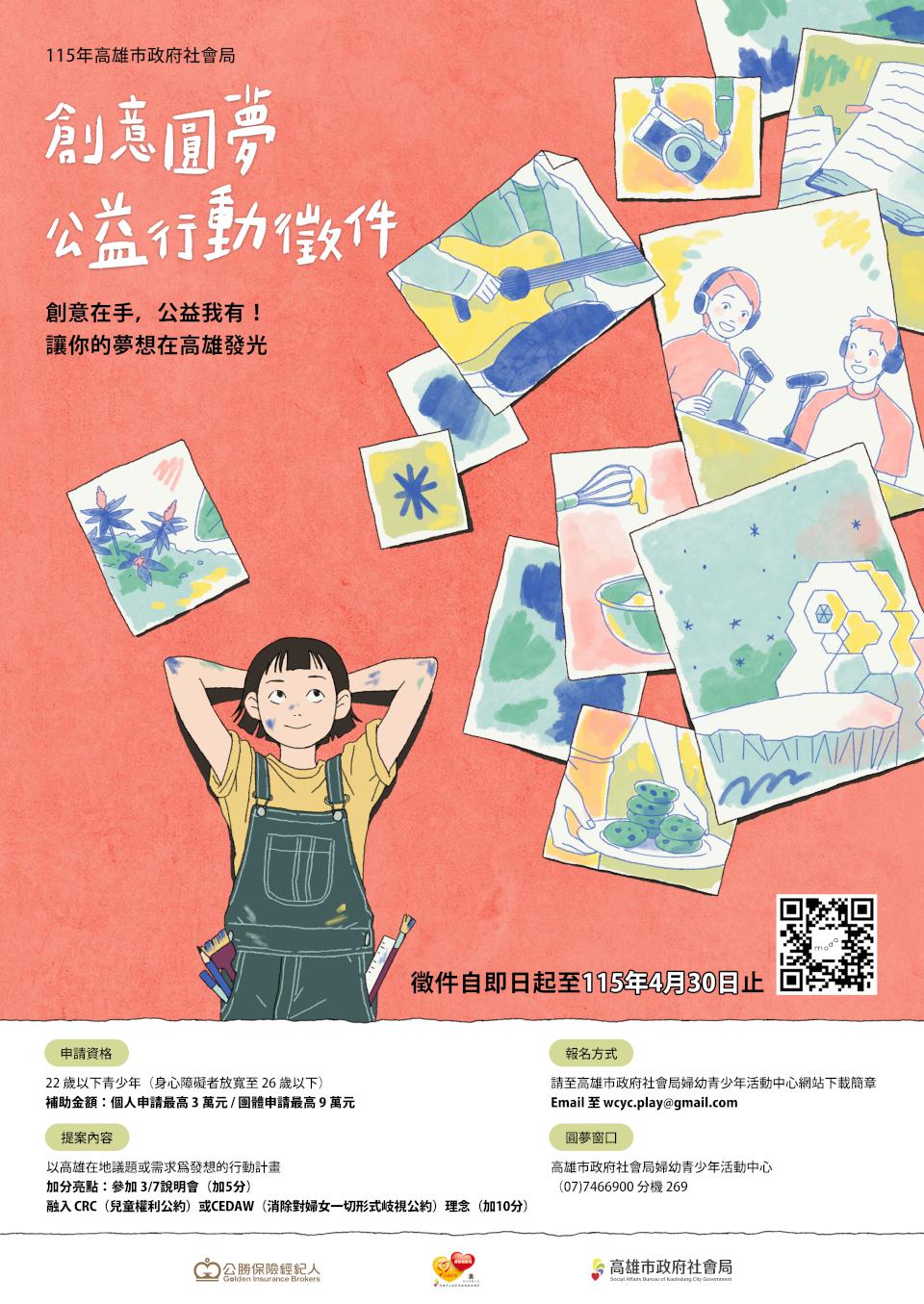 高市社會局115年「創意圓夢•公益行動」徵件活動開放未滿22歲青少年及26歲以下身心障礙朋友個人或組隊申請,114年圓夢團隊進入楠梓特殊教育學校,引導視障學生透過觸聽嗅覺體驗接觸畫作,也有兒少照顧服務據點成長者提案劇場體驗營,透過戲劇遊戲與角色扮演,引導孩童練習表達與合作強化自信,用自身力量回饋社會。每組最高補助9萬元,提案內容結合兒童權利公約(CRC)及消除對婦女一切形式歧視公約(CEDAW)精神及參與3月7日社會局婦幼中心申請說明會可獲加分,相關徵件資訊可上社會局婦幼青少年活動中心官網查詢。圖/社會局提供、文/高培德