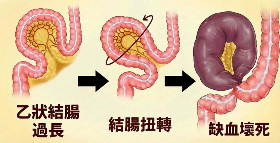 高市70歲陳姓老翁2個月前急性心肌梗塞接受心導管手術與置放支架,左腹脹痛且便祕一週,高市民生醫院大腸直腸外科主任王心泰檢查確診乙狀大腸扭轉合併腸壞死,緊急手術保命,王心泰說,左下腹乙狀大腸彎曲狀如英文字母S 或中文「乙」字,大腸扭轉風險占約7成,滿70歲男性、長期便秘、安養機構住民、神經系統疾病等是好發族群,典型乙狀大腸扭轉透過腹部X光呈現倒U型或咖啡豆狀,如未及時治療,恐造成腸道缺血、壞死、破損,引起腹膜炎、敗血症,死亡率達70%,傳統施做大腸鏡減壓促使腸道復位,結合禁食、注射抗生素與點滴,但因復發風險高,建議手術治療,民眾如出現腹痛、腹脹、嘔吐、便祕逾一週等症狀速就醫,高風險族群應多攝取高纖維食物、足量飲水、規律運動及固定排便,同時進食細嚼慢嚥並避免暴飲暴食。圖/民生醫院提供、文/高培德