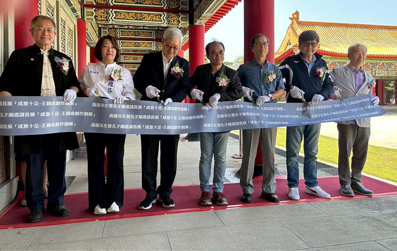 高市高師大文創學會主辦、高市國立高雄師範大學校友會合辦、高市歷史博物館、國立高雄師範大學經學研究所所友會、高市國立高雄師範大學文創所友會協辦「成意十足—王錦成創作個展」4月11日至30日上午9點至下午5點(週一休館)在甫完成修繕左營孔子廟東廡展覽室邀賞,精選高市高師大文創學會創會理事長、高市創意台灣文化協會理事長、高市國際文化藝術協會榮譽理事長、台二藝工坊創辦人王錦成(圖一中)27幅結合台灣民藝書法創作,高市歷史博物館館長李文環(圖一右三)、前高師大校長吳連賞(圖一左三)、高師大校友會理事長吳清亮、藝評家李新等人4月11日開幕式剪綵誌慶。圖/高市高師大文創學會提供、文/高培德