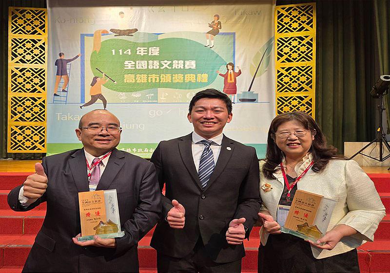 高市教育局114年全國語文競賽頒獎典禮1月10日在中山工商舉行, 50名選手與3隊本土語文讀者劇場獲頒特優,接受教育局長吳立森(圖中)表揚,社會組臺灣台語演說特優林天雄(圖左)與教師組臺灣台語朗讀特優陳淑敏(圖右)賢伉儷,林天雄任職農業部農田水利署高雄管理處,演說結合在地文化與農水使命深獲肯定,三民區獅湖國小教師陳淑敏精準發音與專業教學,展現本土語師資實力。