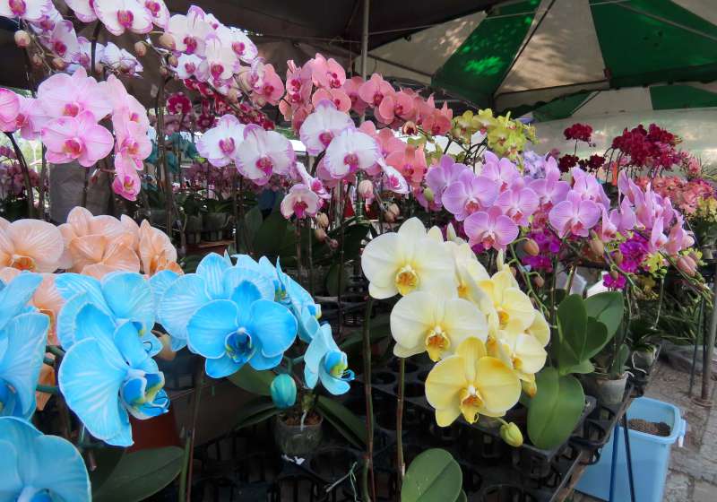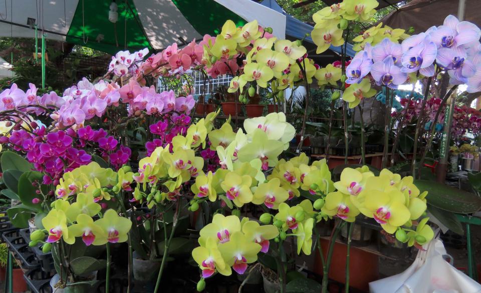 蘭花農林寶鎮說,花展期間現貨供應,各式大小花卉自由選購。蘭花農張仁忠展售萬代蘭、千代蘭、百代蘭,還有陶藝家阿貴各式花器與大家結緣。圖/高市勞工花市提供、文/高培德