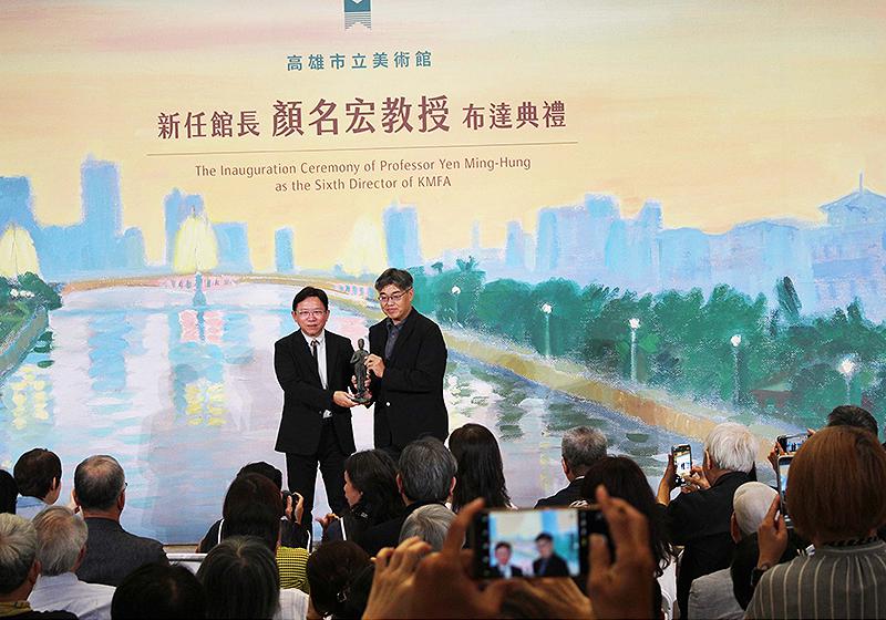 在文化部藝術發展司司長周雅菁、文化局長、行政法人高雄市專業文化機構董事長王文翠、高美館歷任館長黃才郎、謝佩霓、李玉玲等人見證下,國立臺中教育大學文化創意產業設計與營運系教授、林之助紀念館館長顏名宏(圖左)8月1日從高市副市長李懷仁(圖右)手中接過復刻版黃土水《釋迦出山》銅像,正式接下高市美術館第6任館長,宣示秉持地域文化特質、美學扎根生活、藝術教育攜手、文化國際接軌等核心策略,領軍團隊持續從園區向外擴散,深入市民日常,躋身根植在地、鏈結亞太、推動南島文化對話城市文化引擎。