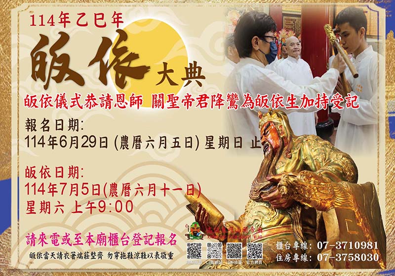 7月5日上午9點皈依大典即日起至6月29日開放報名,7月16日至18日萬人點燈祈天消災賜福大法會、壽無疆慶典、犒軍祈福,7月13日上午10點契子回家團拜賀壽,分靈金身回山認證儀式預計逾千尊金身回娘家,6月22日報名截止,9月7日中元普渡盂蘭盆法會普渡每桌2500元,供品可攜回或捐做公益。