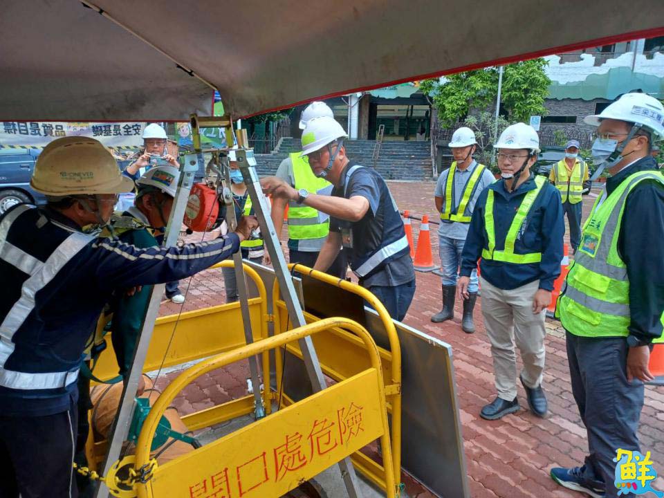 為強化污水相關設施局限空間作業安全意識與應變能力,高市府水利局蔡長展局長於日前至二苓國小視察「局限空間災害應變演練」,演練重點在於強化作業人員進入局限空間前,執行通風換氣與氣體監測之步驟,並模擬作業人員進入污水管渠時發生缺氧昏迷情境,透過即時通報、疏散、急救等程序,驗證應變機制與人員熟練度,確保實際事故發生時可迅速應對,保障工作人員生命安全。