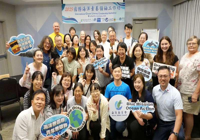 海洋委員會科技文教處處長林麗英(圖一二排左四)領軍台灣代表團,首次遴選近30名海洋素養推廣教師與學者,參與美國國家海洋教育者協會(NMEA)6月29日至7月3日在美國路易斯安那州舉行第50屆年會及會前2025國際海洋素養領袖工作坊,海委會主委管碧玲說,呼應聯合國海洋科學促進永續發展十年(2021至2030年)倡議,海委會規劃114年至117年投入3億9400萬元,力推建構海洋素養典範國家計畫,紮根海洋素養理念,團隊參與國際四大海洋教育年會交流經驗,有助提升台灣理解海洋議題能力,拓展跨文化海洋素養視野。