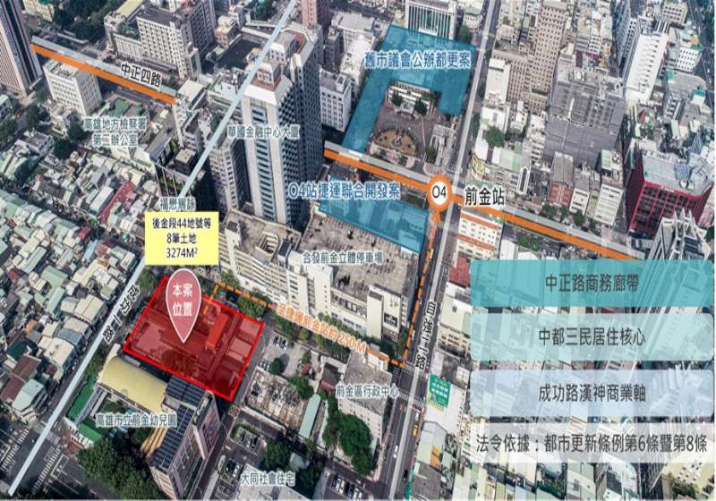 另一案由為「前金區後金段44地號等土地劃定都市更新地區案」,該案鄰近捷運橘線O4站,市府結合TOD大眾運輸導向,為促進土地有效利用,提升都市機能,未來將由捷運局將以公辦都更開發,導入住宅、商業、社福設施與多功能開放空間,推動捷運導向生活機能核心,兼顧TOD發展理念與市有資產活化效益,並挹注軌道建設經費。