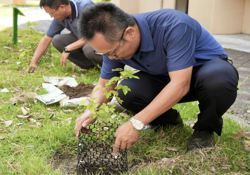 高市左營區文府國中114年應屆畢業生5月 21日總動員植樹,並相約返校見證樹苗長大感動,校長林啟文、家長會長謝秉濠示範正確植樹流程,林啟文活動前與總務主任林俊志前進燕巢深水苗圃選苗,每班配發5至6株原生種樹苗。