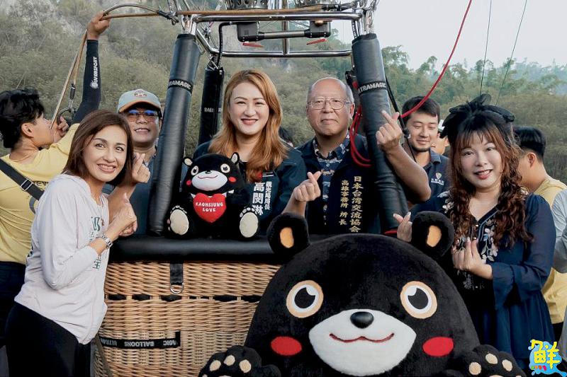 ▲(由左至右)立法委員邱議瑩、馬尼拉經濟文化辦事處長崔瑞霞、高閔琳局長、日本台灣交流協會高雄事務所長奧正史及李亞築議員等人於熱氣球藤籃前合影。