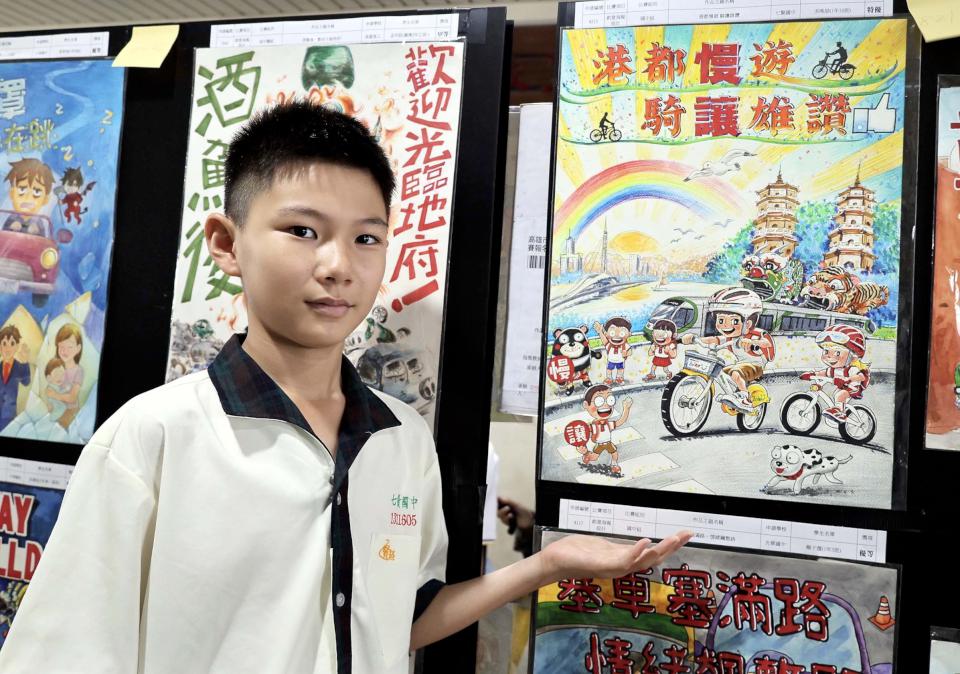 七賢國中一年級洪唯喆(圖二)《港都漫遊。騎讓雄讚》創意海報設計國中組特優,他說,國中騎自行車機會變多,透過公共自行車串連特色景點,並融入觀光局吉祥物高雄熊持慢、讓手板,提醒單車族經過行人穿越道優先禮讓。