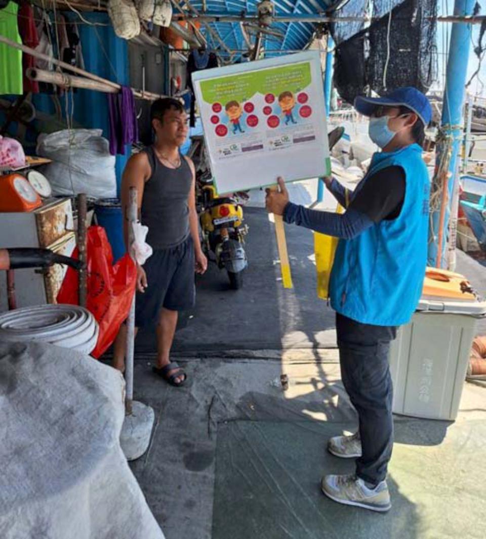 雨後積水易孳生病媒蚊,持續透過發放多國語言衛教摺頁,宣導外籍漁工辨識登革熱症狀、清除積水容器及維護船艙整潔,嚴防登革熱疫情。圖/海洋局提供、文/高培德