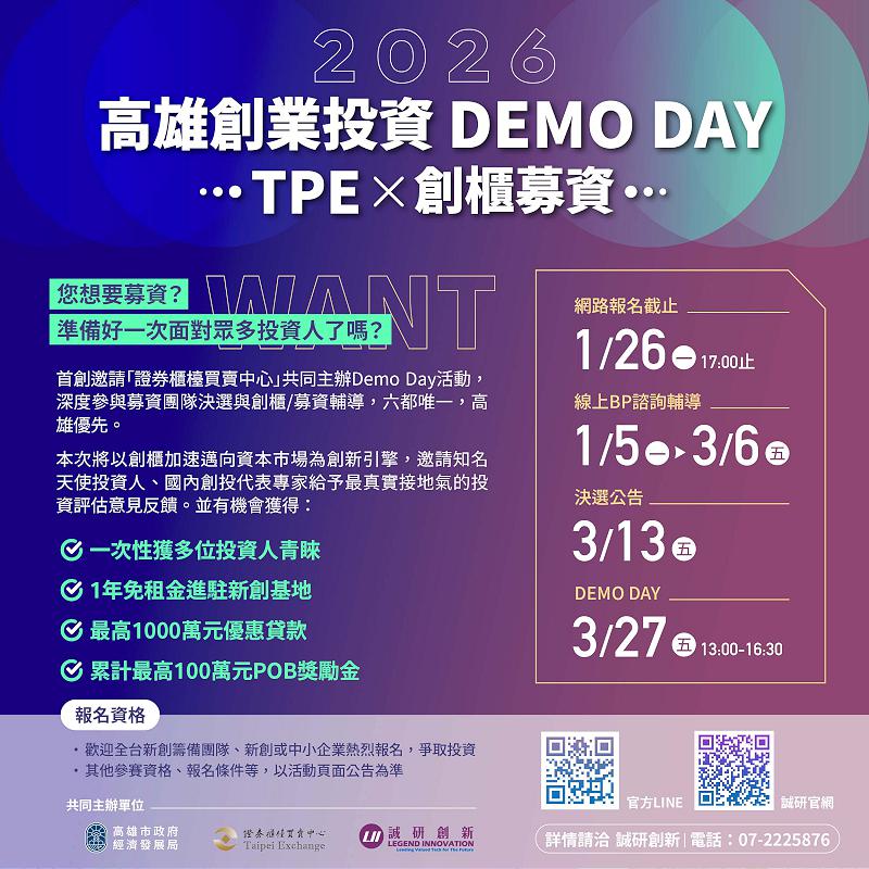 2026第三屆高雄創業投資DEMO DAY—TPEx創櫃募資」,首度攜手證券櫃檯買賣中心(TPEx),導入資本市場制度資源,整合創櫃板機制、投資實務與實戰型BP簡報訓練,協助創業團隊對接資本市場、取得關鍵資金與人脈加速成長,即日起至1月26日歡迎新創與中小企業報名。