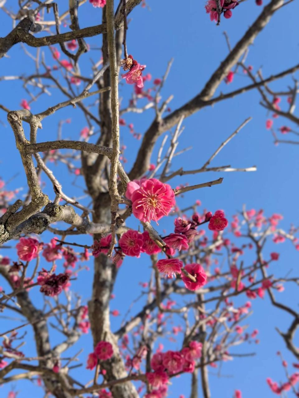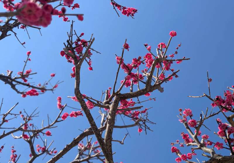 白色、紅色的梅花,在沒有綠葉襯托的季節裡,「花」本身就是主角。我靠近花樹,拿起手機,慢慢移動著,360度地拍著梅花。就好像,把這份「好看」帶回家。