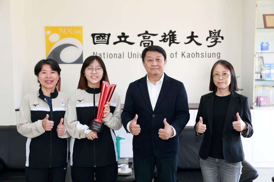 國立高雄大學運動健康與休閒系碩士生田曉雯(圖左二)2月前進新加坡桌球大滿貫賽(Singapore Smash),帕拉桌球女子單打第10級決賽直落三立退瑞典選手漢登(Anja Handen)打下金牌,3月12日接受校長陳啓仁(圖右二)嘉勉,學務長王明月(圖左一)、運健休系主任吳佩芳(圖右一)與有榮焉。