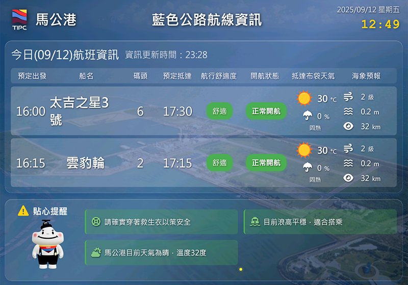 臺灣港務藍色公路布馬航線資訊網正式上線,數位化整合海氣象及航班資訊,便利旅客即時掌握。