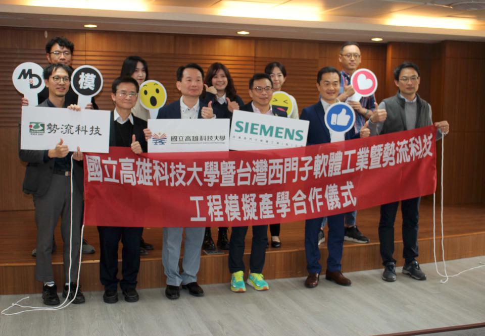 國立高雄科技大學校長吳忠信(圖一中)2月3日與台灣西門子軟體工業董事長陳皓璋(圖一左)、勢流科技總經理陳忠懋(圖一右)等人簽約產學合作,宣示深化與模具工程系教學、研究、產業合作關係,培育即戰力工程及模擬專業人才,高科大模具工程系主歐士輔(圖二左一)等人見證。