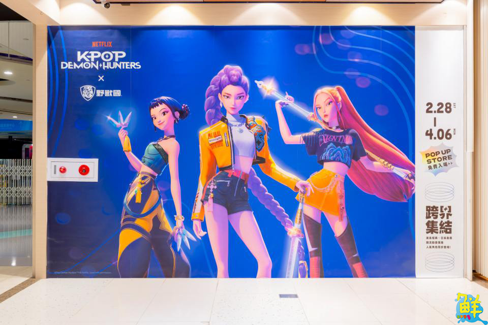 ▲展場設有風靡全球的K-pop獵魔女團《HUNTRX》主題打卡牆,展現流行音樂與動畫跨界整合的魅力。(圖/夢時代提供)