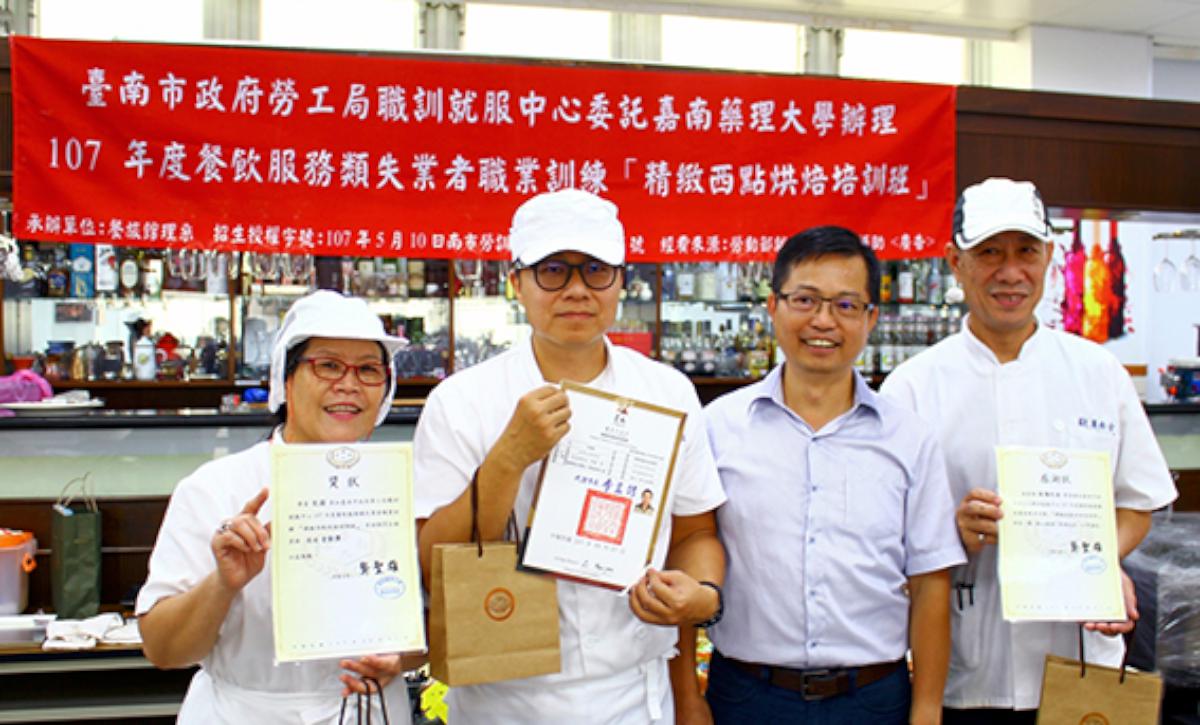 台南市政府勞工局職訓就服中心委託嘉南藥理大學,辦理餐飲服務類失業者職業訓練「精緻西點烘焙培訓班」,9/7 (五)下午於該校餐飲大樓舉行結訓成果展。25位參訓學員使出絕活,展現接受400小時訓練後之廚藝,現場端出道道美食香氣撲鼻,令人食指大動,充分顯示學員努力付出的心血佳作,成果相當亮眼。