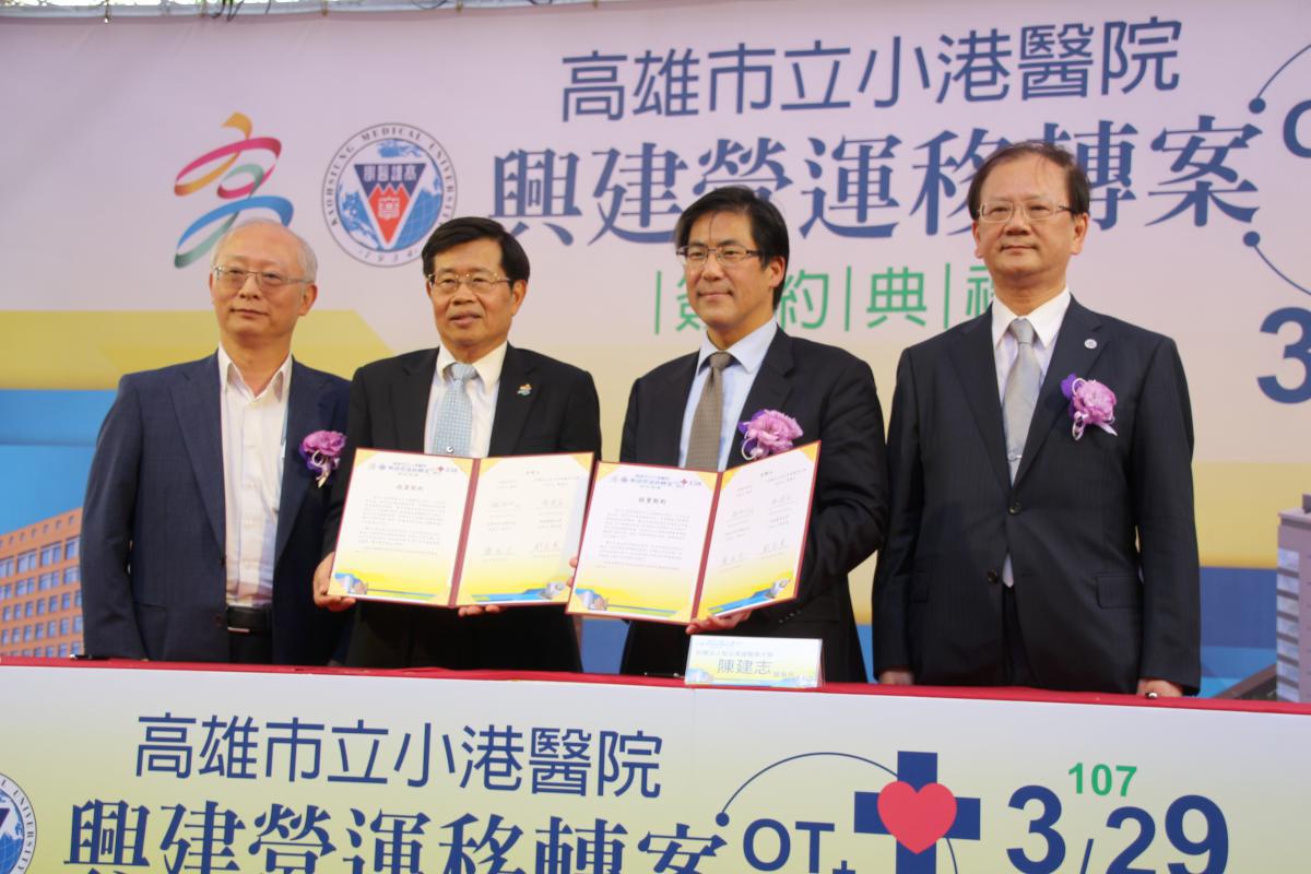 高市副市長楊明州、衛生局長黃志中、高醫大董事會董事長陳建志、高醫大校長劉景寬等人3月29日共同簽署小港醫院興建營運移轉案,宣布原醫療大樓與東側新棟醫療大樓分別採營運移轉(OT)及興建營運移轉(BOT)方式辦理,期能有效紓解門急診壅塞現況。