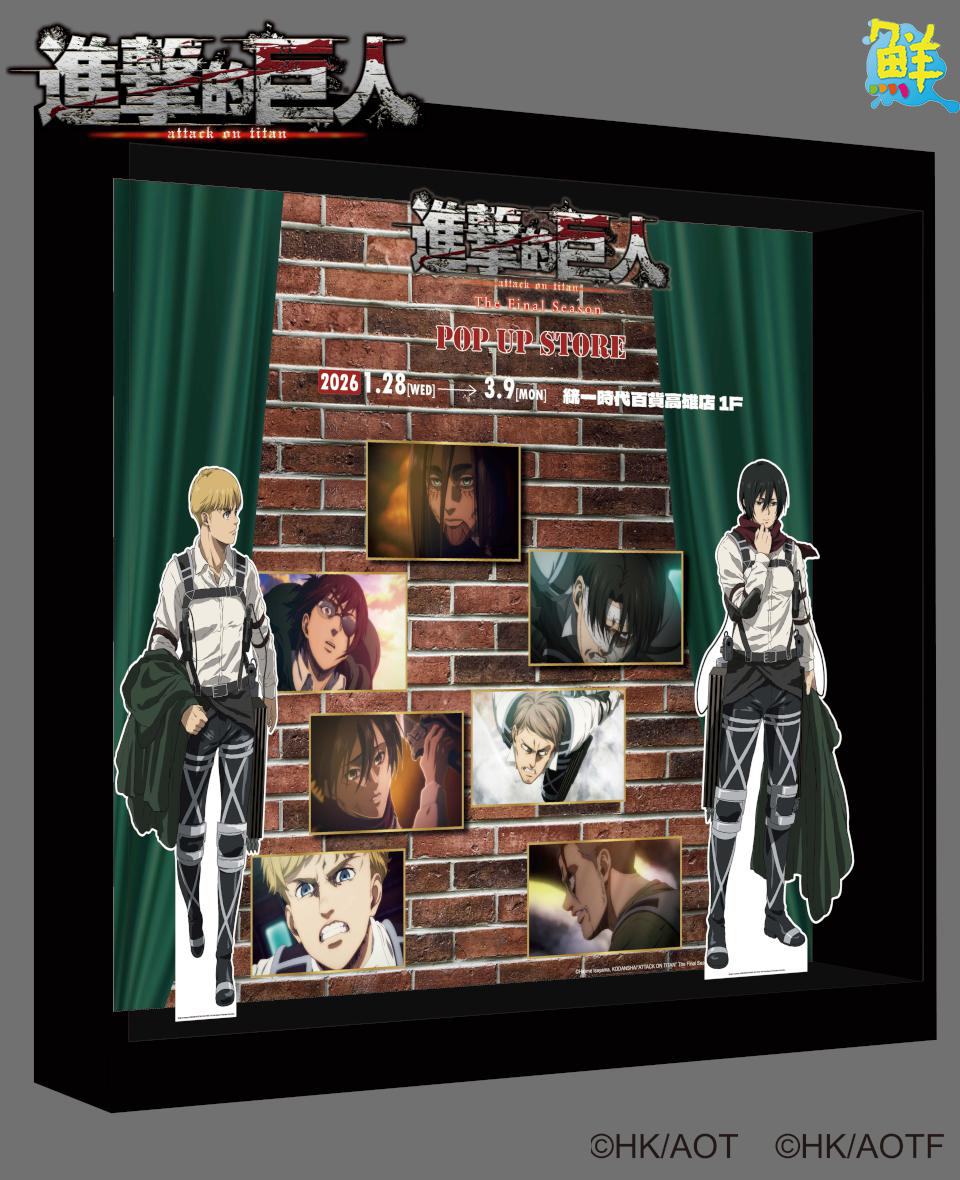 《進擊的巨人:The Final Season》快閃店1/28-3/9在統一時代百貨高雄店登場!四大拍照打卡點首推一到店就會被帥到,集結米卡莎、里維及約翰等主要角色的「天與地之戰」,還有「米卡莎與阿爾敏」櫥窗區,最後別忘了「經典回顧牆」,細細回憶調查兵團成員們聯手對抗世界末日的最終戰!快閃店更推出超過六十款全新週邊商品,粉絲可別錯過!