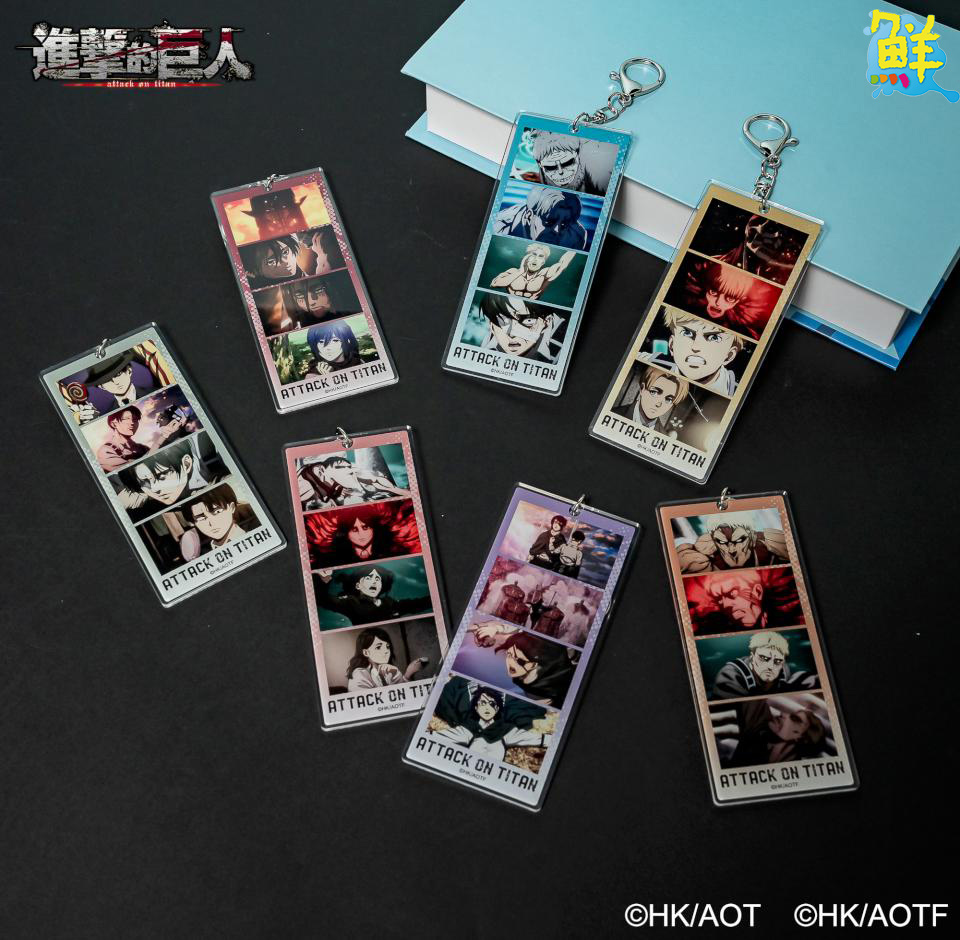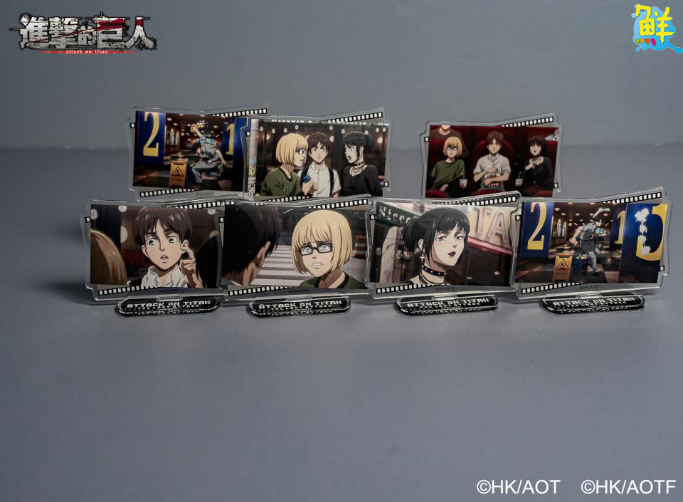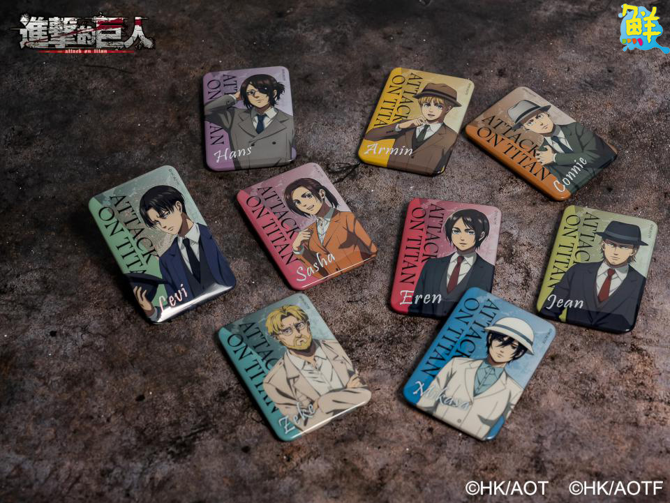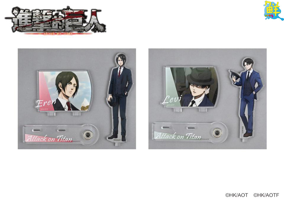 此次週邊商品推出兩款艾連和兵長配上紅綠潑墨的「抽拉票根吊飾」一拉一闔都能滿足你。兩款主角的「旋轉立牌」擺在桌上,看著里維和艾連轉著轉著,煩惱都消失啦!還有四款艾連、里維、阿爾敏和米卡莎身穿西裝的加厚「角色鑰匙圈」。另外還有九款「長方徽章」及六款「相框磁鐵」盲抽等你帶回家!