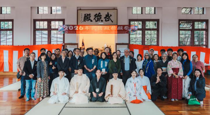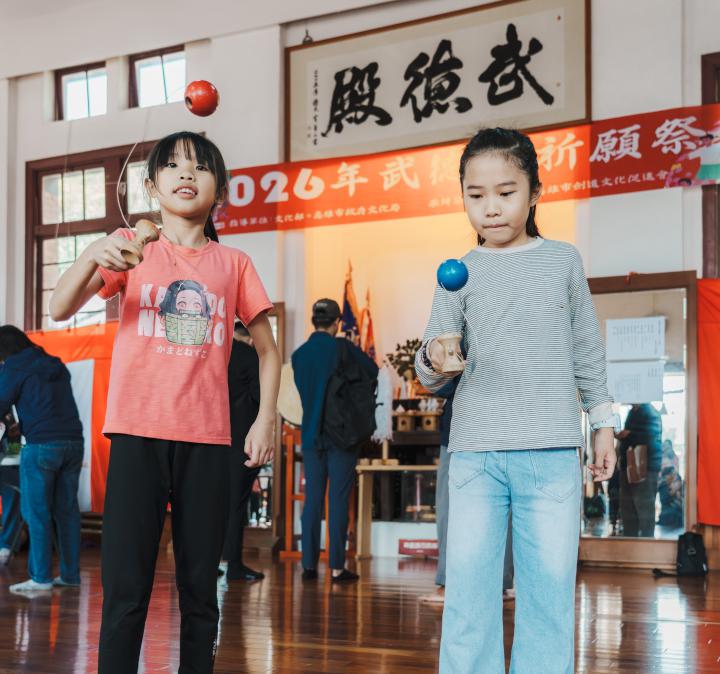 高雄市定古蹟武德殿115年祈願祭 日式童玩體驗吸引大小朋友同樂 2026/01/31 高培德 84高雄市定古蹟武德殿115年祈願祭1月31日舉行,力邀橿原神宮神主園池庸平將、石鎚神社石鎚本教出身台灣神主陳凱鈞擔任執行神事,台灣日本神道崇敬會創會理事長李明勳化身巫女獻上神樂浦安之舞,還有宮本武藏二天一流、無雙直傳英信流演武等精彩演出,高市文化局專委曾宏民、運動發展局局長侯尊堯、高市劍道文化促進會理事長陳信寰、日本奈良縣橿原市觀光大使間瀨雅美、國立中山大學西灣學院教授伊藤佳代等人參與,規劃搗麻糬、吹箭、劍玉、不倒翁、忍者體驗等日式童玩體驗,吸引大小朋友同樂。圖/文化局提供、文/高培德